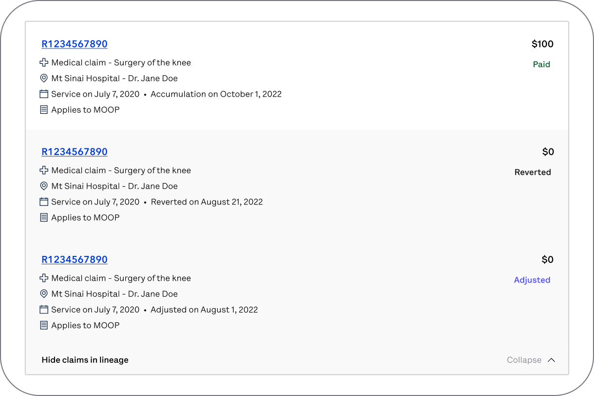 Change number 2: Collapsing adjustmentsOur claims card now has the ability to collapse historical information behind it so rather than having a new claim for each possible adjustment, now the most up to date information will always be shown up front while the historical context is a click away.